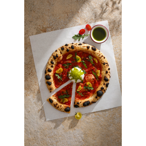 Domates sosu, taze burrata, renkli şeker domatesle...